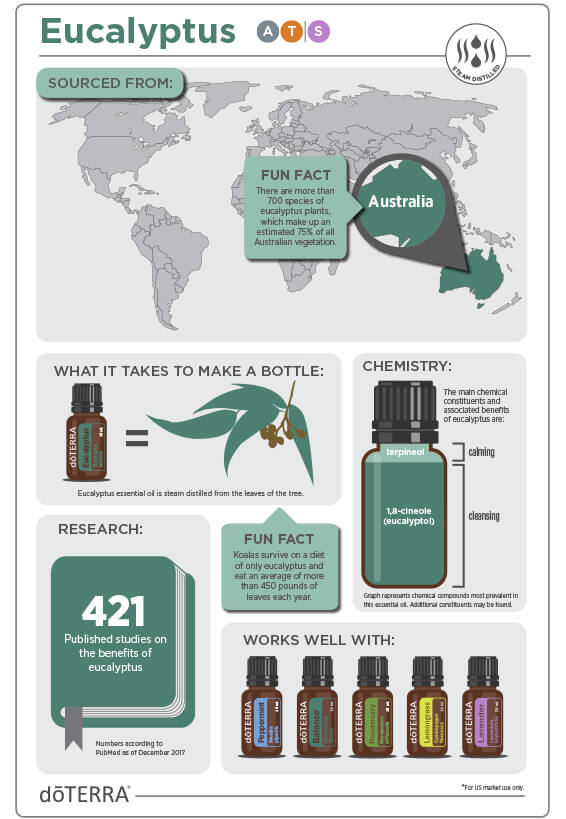 Od setek lat rdzenni mieszkańcy Australii wykorzystywali liście eukaliptusa do łagodzenia podrażnień skóry i odkażania ran oraz przy przeziębieniach i gorączce. Do rodzaju Eukaliptus należy ponad 600 gatunków drzew i krzewów, ale tylko kilka jest wykorzystywanych do pozyskiwania olejku eukaliptusowego na potrzeby aromaterapii. Olejki pozyskane z różnych gatunków różnią się składem chemicznym i właściwościami. Olejek eukaliptusowy doTERRA jest pozyskiwany metodą destylacji parą wodną ze świeżych liści wiecznie zielonych drzew gatunku Eucalyptus radiata rosnących w Australii i ma czysty, świeży, lekko kamforowy aromat.